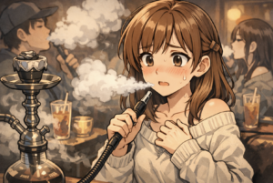 一酸化炭素も発生します。炭を使用するため、換気の悪い場所で長時間吸うと一酸化炭素中毒のリスクがあります。シーシャカフェでは換気設備が整っているため問題ありませんが、自宅で楽しむ際は十分な換気が必要です。